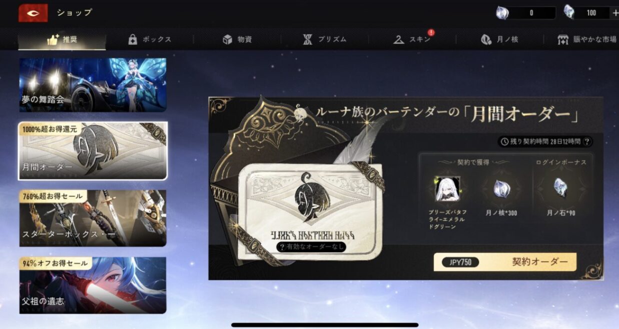 契約と同時に「ブリーズバタフライ・エメラルドグリーン」スキンや「月ノ核×300」「月ノ石×90」などの豪華特典が付いてきます。