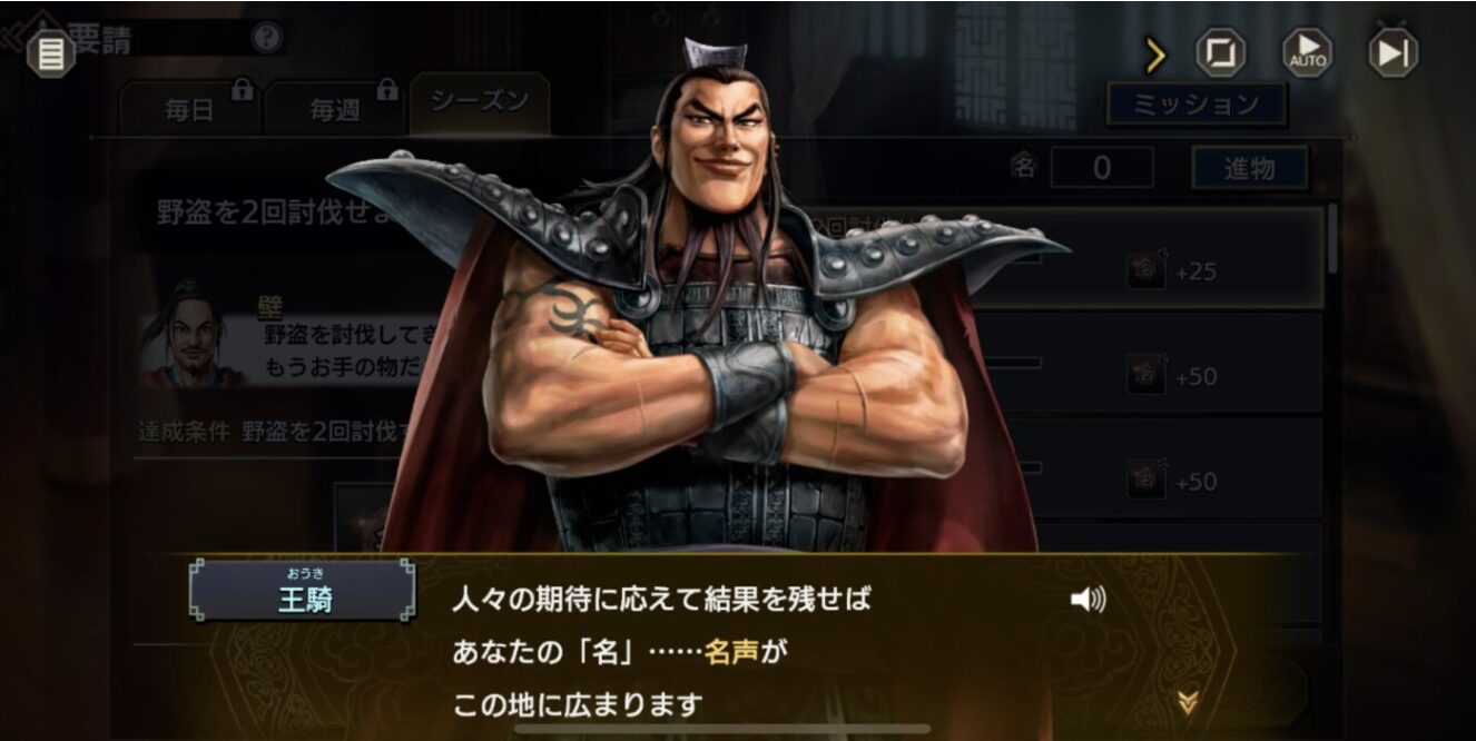 プレイヤーは信や王騎といったお馴染みのキャラクターに導かれながら、部隊の編成方法や進軍の仕組み、戦場での基本操作を学んでいきます。