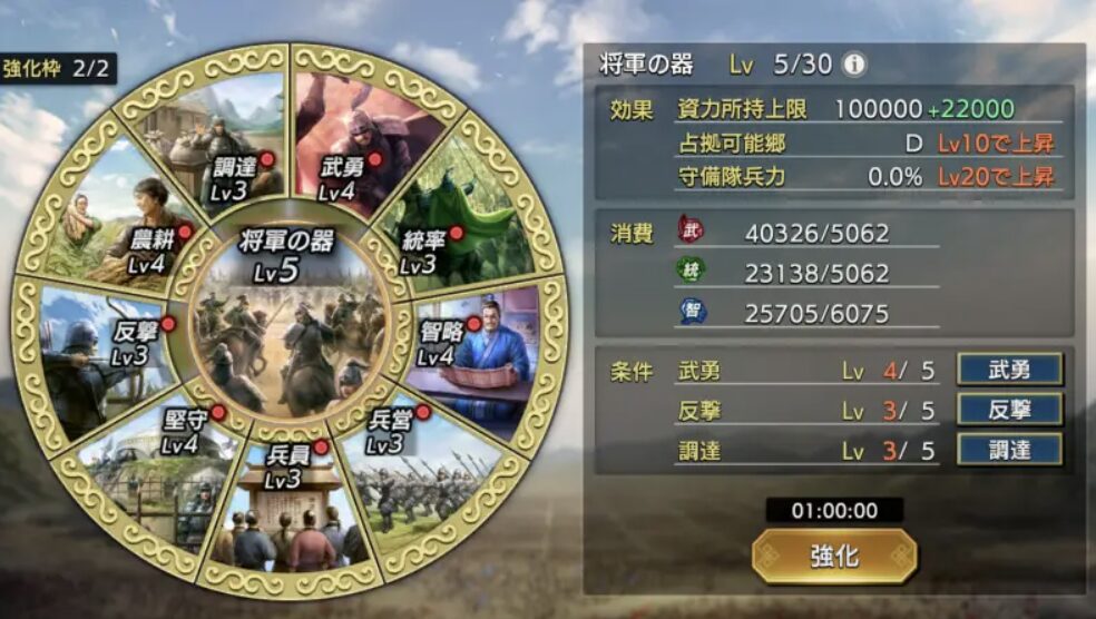 軍備(内政)施設では定番の城レベルではなく、心得と呼ばれるステータスを強化していきます。