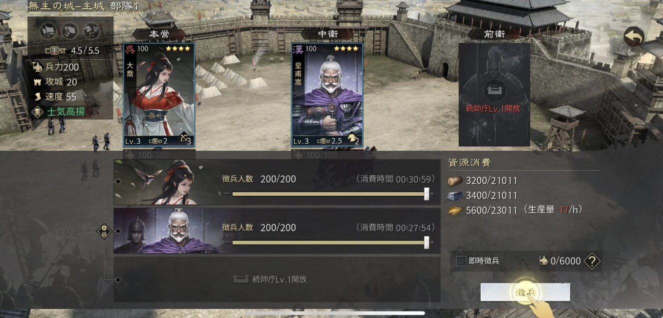 チュートリアルに沿って進めていくと「大喬」「皇甫嵩」の武将を手にれることができます。