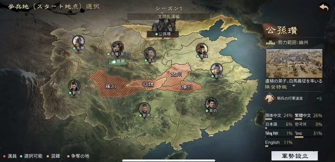 最初に9つの陣営となる挙兵地を選択します。
