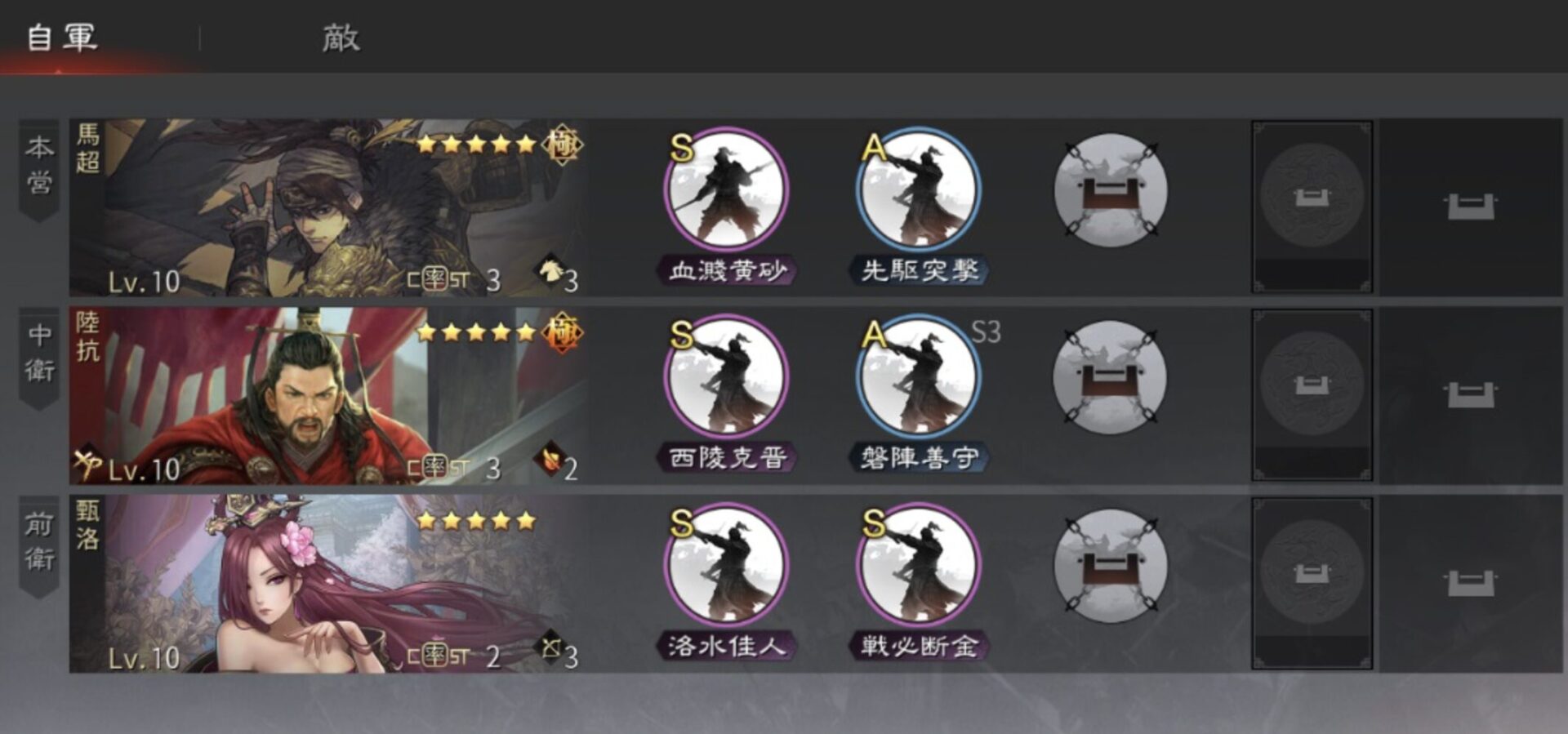 部隊は本営・中衛・前衛にそれぞれ武将を一人ずつセットして編成します。